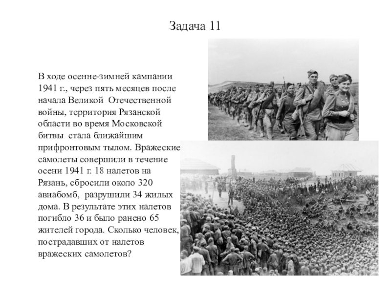 пять месяцев после начала Великой Отечественной войны, территория Рязанской области во время Московской битвы стала ближайшим прифронтовым тылом. Вражеские самолеты совершили в течение осени 1941 г. 18 налетов на Рязань, сбросили около 320 авиабомб, разрушили 34 жилых дома. В результате этих налетов погибло 36 и было ранено 65 жителей города. Сколько человек, пострадавших от налетов вражеских самолетов?