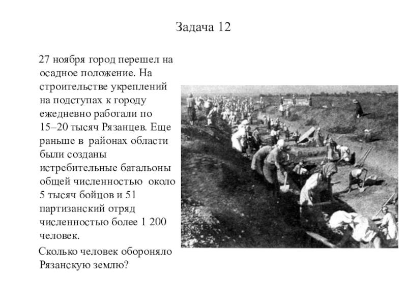 На строительстве укреплений на подступах к городу ежедневно работали по 15–20 тысяч Рязанцев. Еще раньше в районах области были созданы истребительные батальоны общей численностью около 5 тысяч бойцов и 51 партизанский отряд численностью более 1 200 человек.