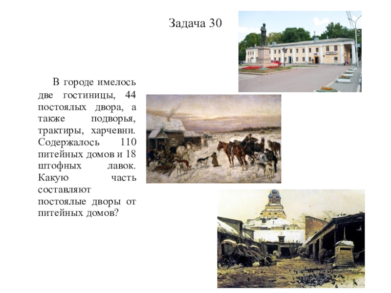 двора, а также подворья, трактиры, харчевни. Содержалось 110 питейных домов и 18 штофных лавок. Какую часть составляют постоялые дворы от питейных домов?