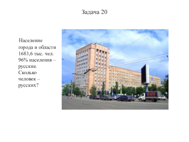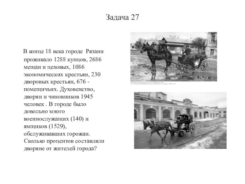 купцов, 2686 мещан и цеховых, 1086 экономических крестьян, 230 дворовых крестьян, 676 - помещичьих. Духовенство, дворян и чиновников 1945 человек . В городе было довольно много военнослужащих (140) и ямщиков (1529), обслуживавших горожан. Сколько процентов составляли дворяне от жителей города?
