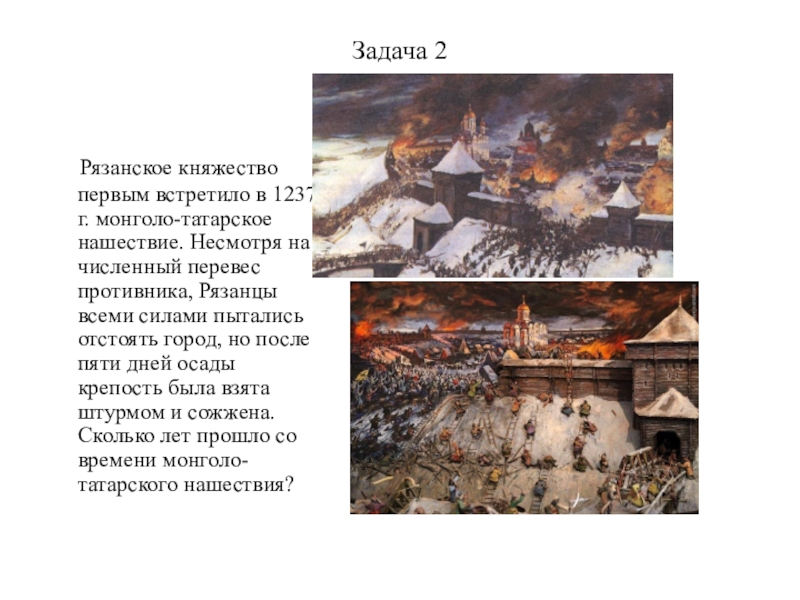нашествие. Несмотря на численный перевес противника, Рязанцы всеми силами пытались отстоять город, но после пяти дней осады крепость была взята штурмом и сожжена. Сколько лет прошло со времени монголо-татарского нашествия?
