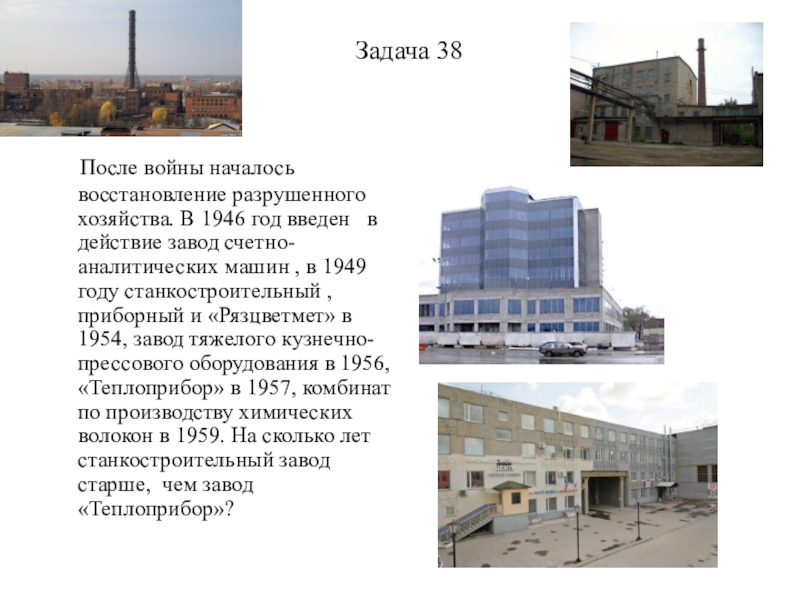 введен в действие завод счетно-аналитических машин , в 1949 году станкостроительный , приборный и «Рязцветмет» в 1954, завод тяжелого кузнечно-прессового оборудования в 1956, «Теплоприбор» в 1957, комбинат по производству химических волокон в 1959. На сколько лет станкостроительный завод старше, чем завод «Теплоприбор»?