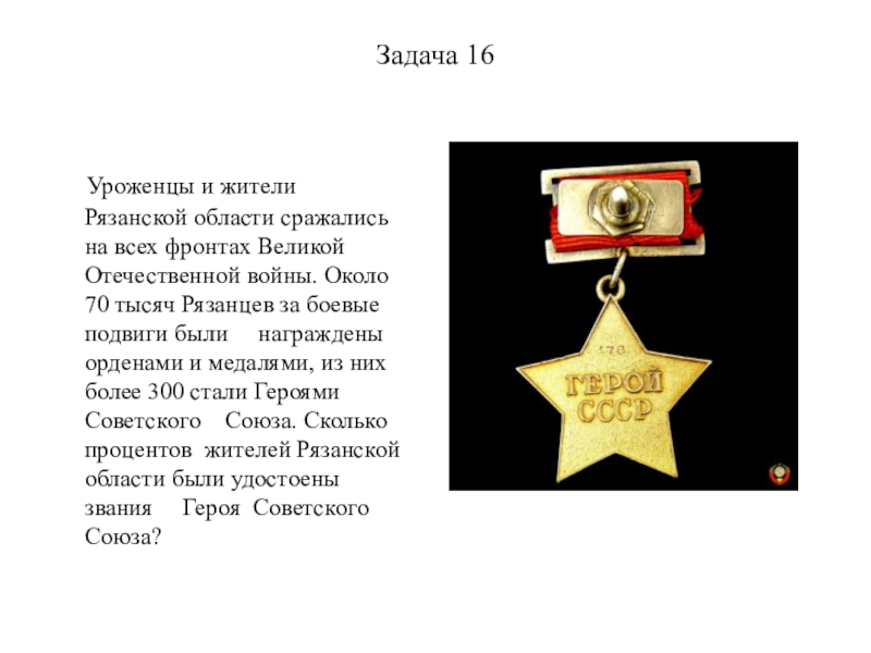 фронтах Великой Отечественной войны. Около 70 тысяч Рязанцев за боевые подвиги были награждены орденами и медалями, из них более 300 стали Героями Советского Союза. Сколько процентов жителей Рязанской области были удостоены звания Героя Советского Союза?