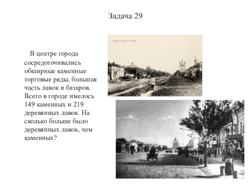 ряды, большая часть лавок и базаров. Всего в городе имелось 149 каменных и 219 деревянных лавок. На сколько больше было деревянных лавок, чем каменных?