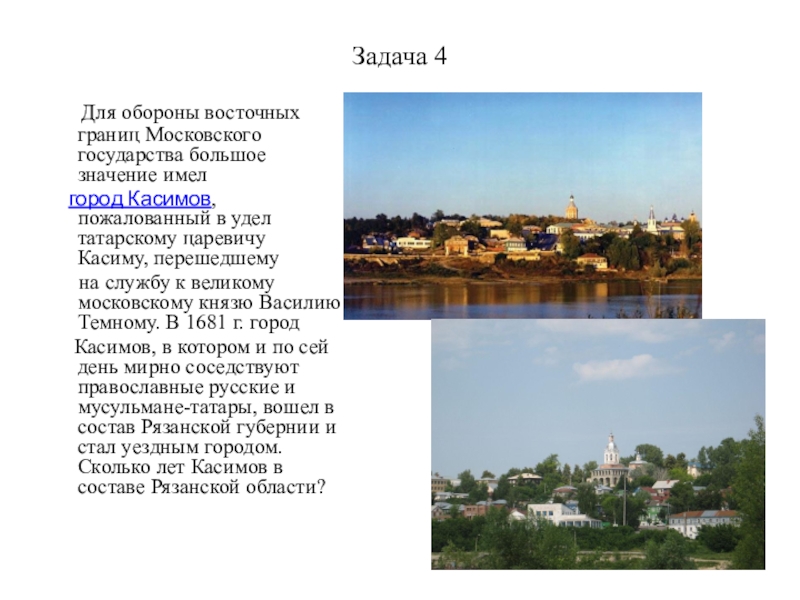 город Касимов, пожалованный в удел татарскому царевичу Касиму, перешедшему