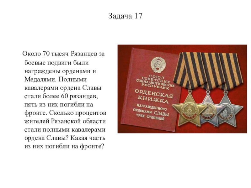 награждены орденами и Медалями. Полными кавалерами ордена Славы стали более 60 рязанцев, пять из них погибли на фронте. Сколько процентов жителей Рязанской области стали полными кавалерами ордена Славы? Какая часть из них погибли на фронте?