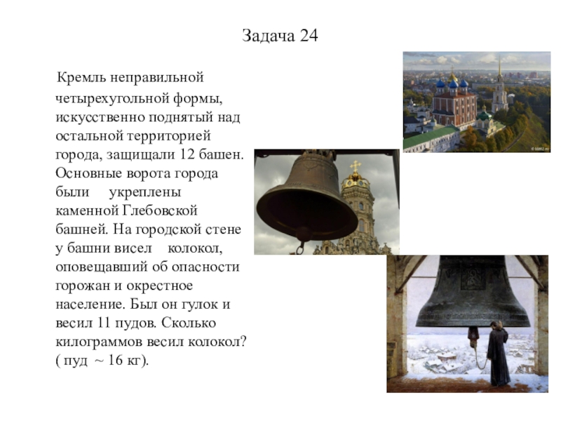 остальной территорией города, защищали 12 башен. Основные ворота города были укреплены каменной Глебовской башней. На городской стене у башни висел колокол, оповещавший об опасности горожан и окрестное население. Был он гулок и весил 11 пудов. Сколько килограммов весил колокол? ( пуд ~ 16 кг).