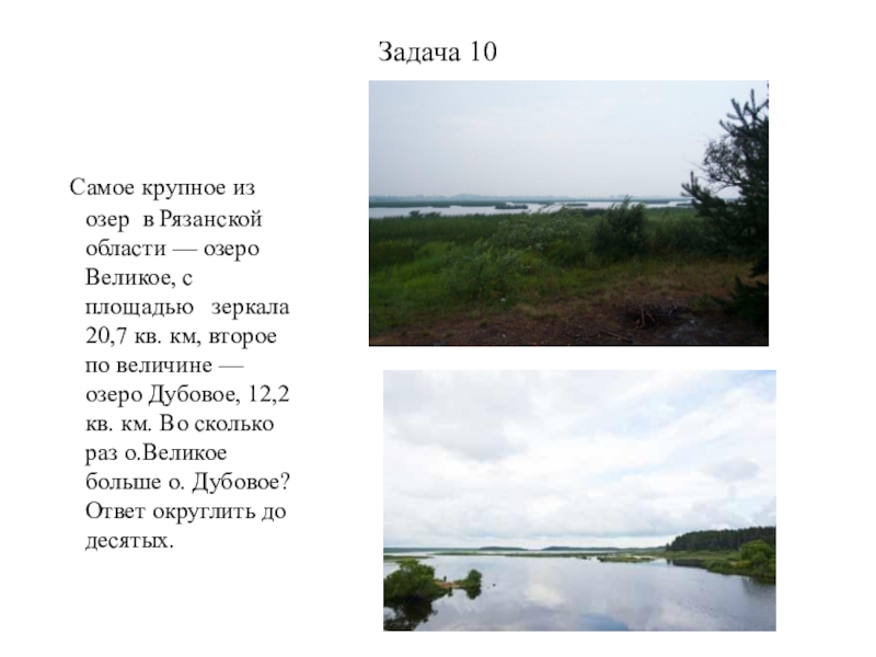 Великое, с площадью зеркала 20,7 кв. км, второе по величине — озеро Дубовое, 12,2 кв. км. Во сколько раз о.Великое больше о. Дубовое? Ответ округлить до десятых.