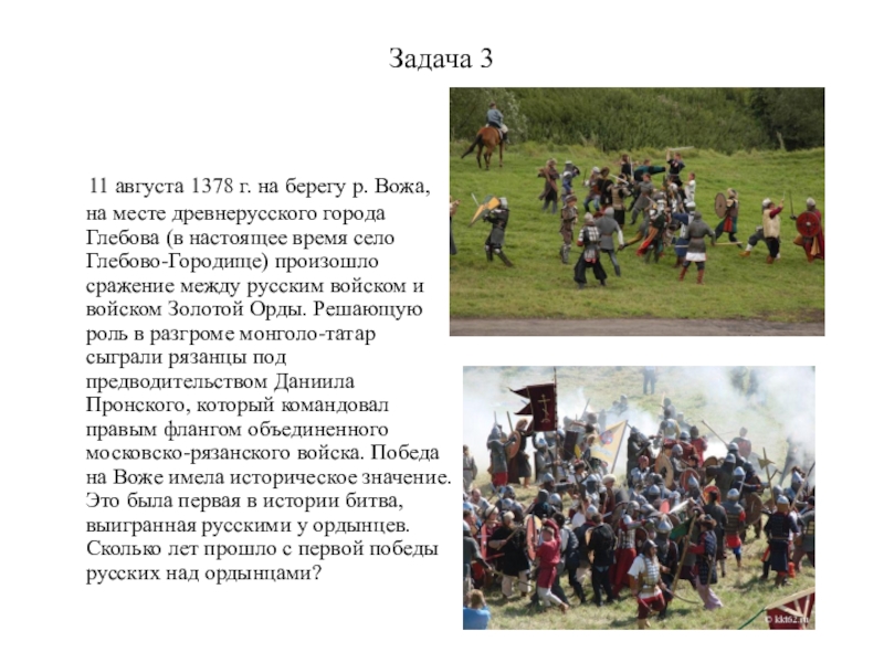 на месте древнерусского города Глебова (в настоящее время село Глебово-Городище) произошло сражение между русским войском и войском Золотой Орды. Решающую роль в разгроме монголо-татар сыграли рязанцы под предводительством Даниила Пронского, который командовал правым флангом объединенного московско-рязанского войска. Победа на Воже имела историческое значение. Это была первая в истории битва, выигранная русскими у ордынцев. Сколько лет прошло с первой победы русских над ордынцами?