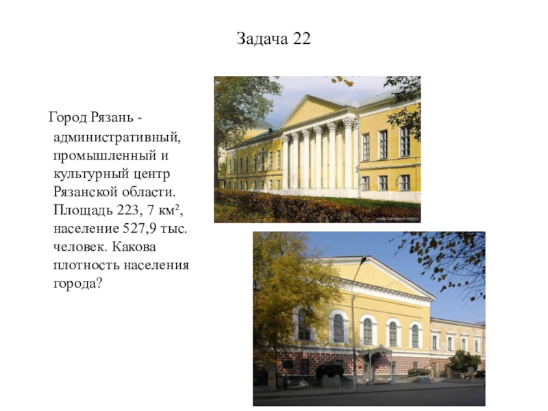 Рязанской области. Площадь 223, 7 км², население 527,9 тыс. человек. Какова плотность населения города?