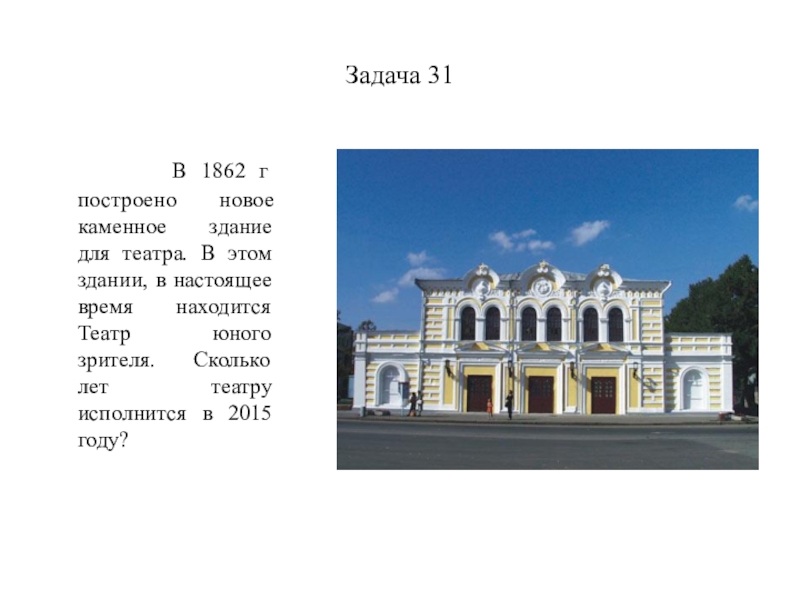 для театра. В этом здании, в настоящее время находится Театр юного зрителя. Сколько лет театру исполнится в 2015 году?