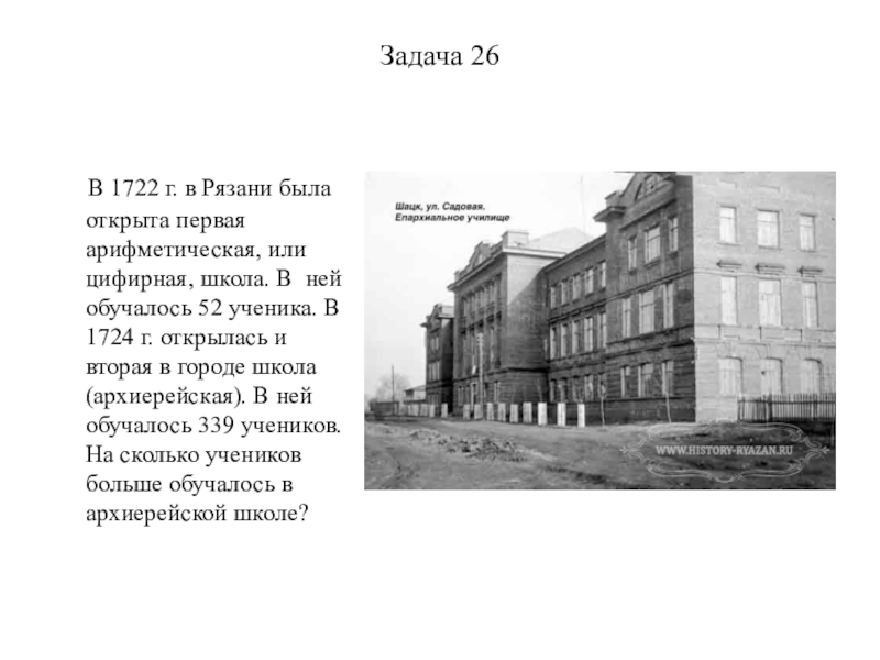 арифметическая, или цифирная, школа. В ней обучалось 52 ученика. В 1724 г. открылась и вторая в городе школа (архиерейская). В ней обучалось 339 учеников. На сколько учеников больше обучалось в архиерейской школе?