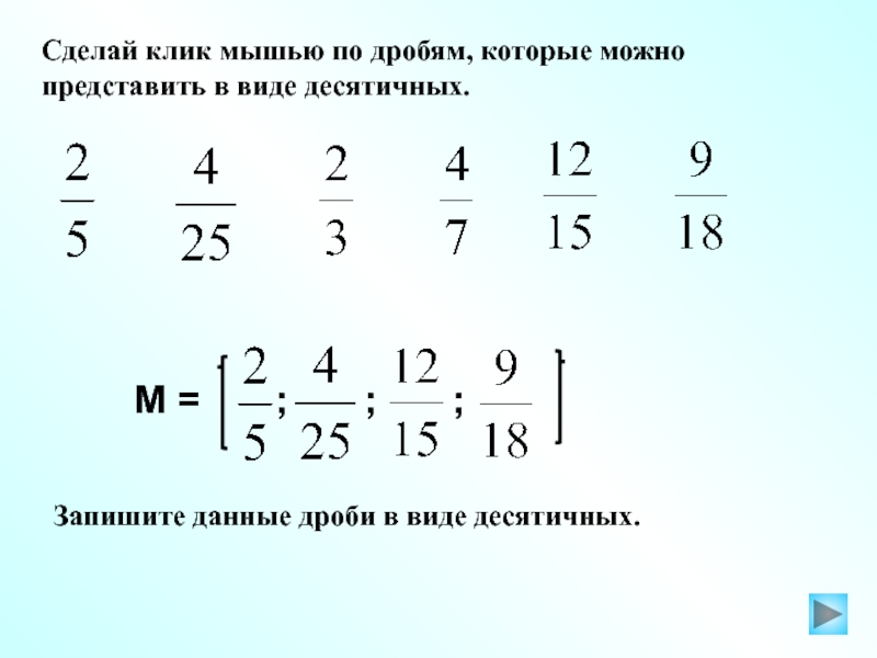 Запишите данные дроби в виде десятичных.