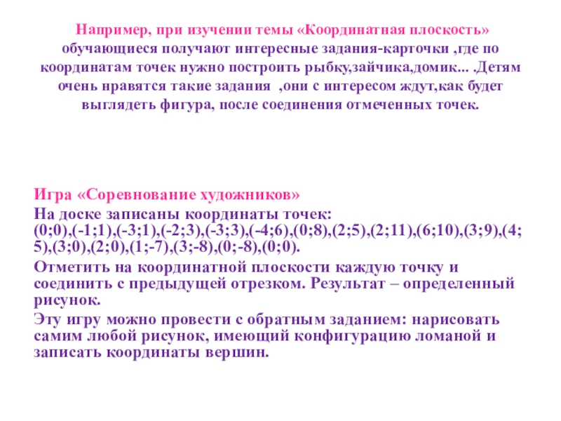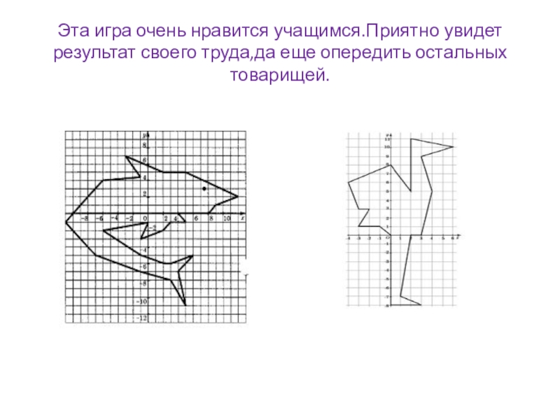 Эту игру можно провести с обратным заданием: нарисовать самим любой рисунок, имеющий конфигурацию ломаной и записать координаты вершин.