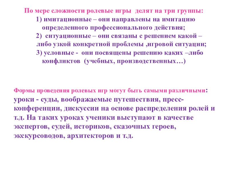 Формы проведения ролевых игр могут быть самыми различными: уроки - суды, воображаемые путешествия, пресс- конференции, дискуссии на основе распределения ролей и т.д. На таких уроках ученики выступают в качестве экспертов, судей, историков, сказочных героев, экскурсоводов, архитекторов и т.д.
