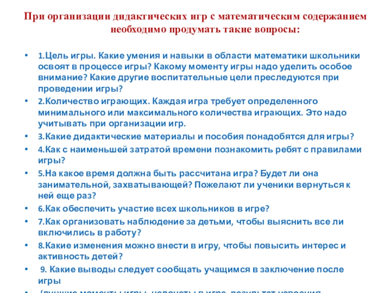 1.Цель игры. Какие умения и навыки в области математики школьники освоят в процессе игры? Какому моменту игры надо уделить особое внимание? Какие другие воспитательные цели преследуются при проведении игры?