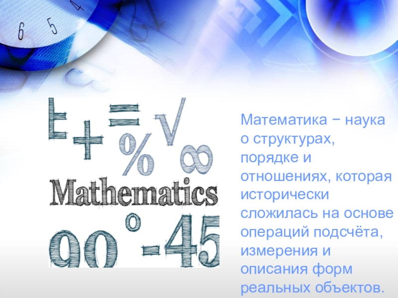Математика − наука о структурах, порядке и отношениях, которая исторически сложилась на основе операций подсчёта, измерения и