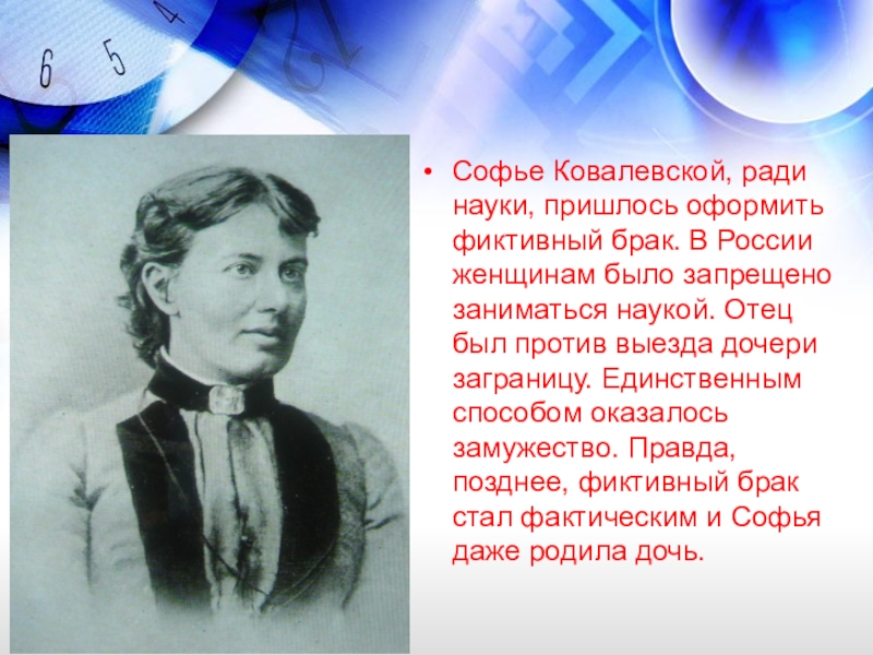 Слайд 12Софье Ковалевской, ради науки, пришлось оформить фиктивный брак. В России женщинам