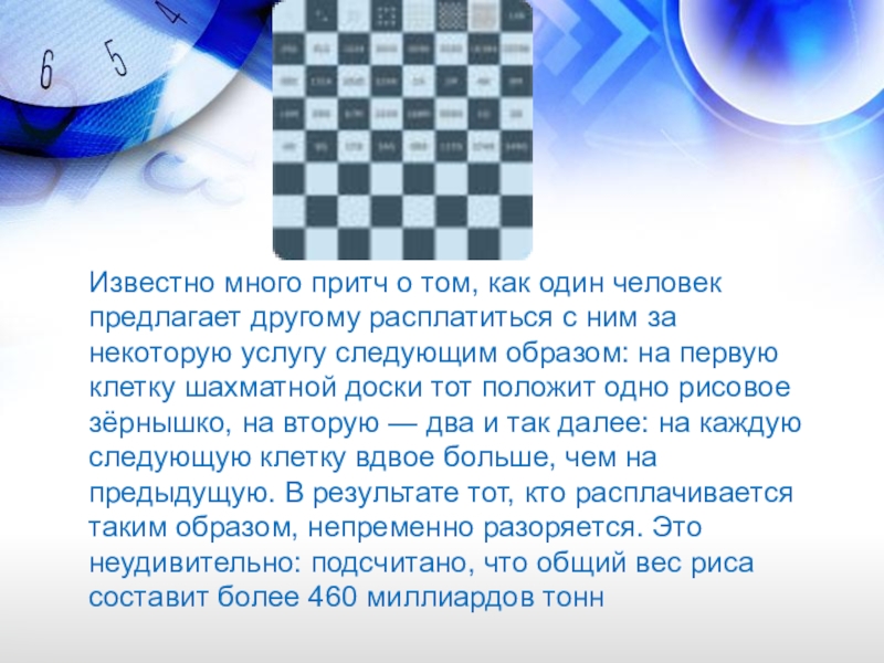 с ним за некоторую услугу следующим образом: на первую клетку шахматной доски тот положит одно рисовое зёрнышко, на вторую — два и так далее: на каждую следующую клетку вдвое больше, чем на предыдущую. В результате тот, кто расплачивается таким образом, непременно разоряется. Это неудивительно: подсчитано, что общий вес риса составит более 460 миллиардов тонн