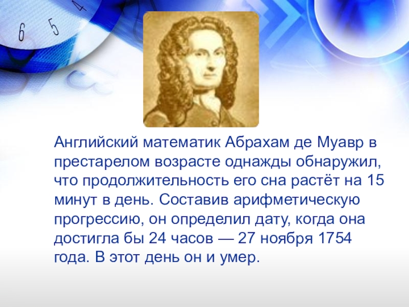 Английский математик Абрахам де Муавр в престарелом возрасте однажды обнаружил, что продолжительность его сна растёт на 15