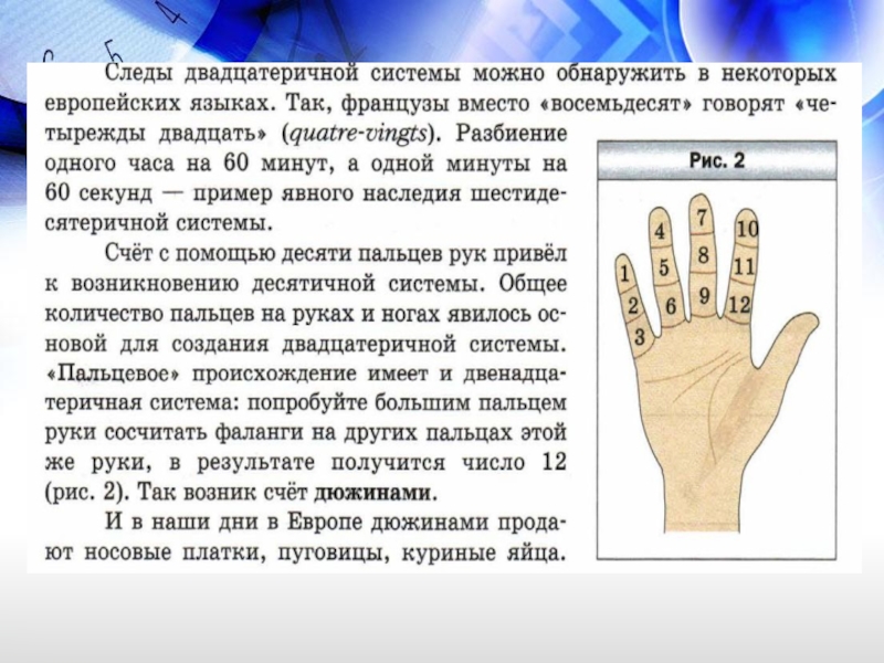 Слайд 5Используемая нами десятичная система счисления возникла по причине того, что у