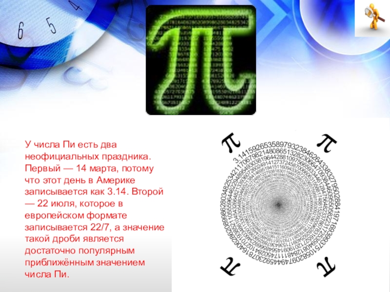 Слайд 4У числа Пи есть два неофициальных праздника. Первый — 14 марта,