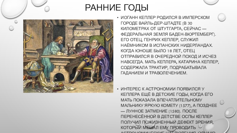от Штутгарта, сейчас — федеральная земля Баден-Вюртемберг). Его отец, Генрих Кеплер, служил наёмником в Испанских Нидерландах. Когда юноше было 18 лет, отец отправился в очередной поход и исчез навсегда. Мать Кеплера, Катарина Кеплер, содержала трактир, подрабатывала гаданием и траволечением.