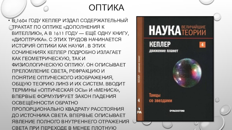Вителлию», а в 1611 году — ещё одну книгу, «Диоптрика». С этих трудов начинается история оптики как науки . В этих сочинениях Кеплер подробно излагает как геометрическую, так и физиологическую оптику. Он описывает преломление света, рефракцию и понятие оптического изображения, общую теорию линз и их систем. Вводит термины «оптическая ось» и «мениск», впервые формулирует закон падения освещённости обратно пропорционально квадрату расстояния до источника света. Впервые описывает явление полного внутреннего отражения света при переходе в менее плотную среду.