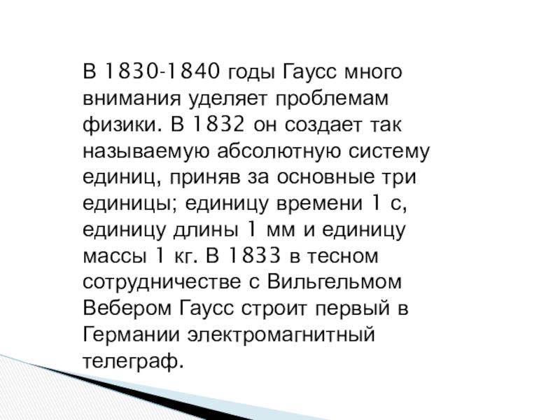 он создает так называемую абсолютную систему единиц, приняв за основные три единицы; единицу времени 1 с, единицу длины 1 мм и единицу массы 1 кг. В 1833 в тесном сотрудничестве с Вильгельмом Вебером Гаусс строит первый в Германии электромагнитный телеграф.
