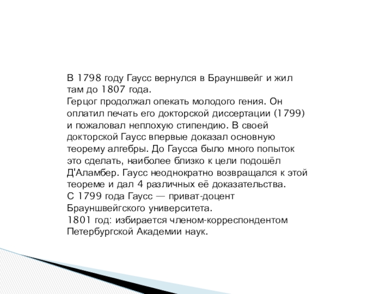 Слайд 15В 1798 году Гаусс вернулся в Брауншвейг и жил там до