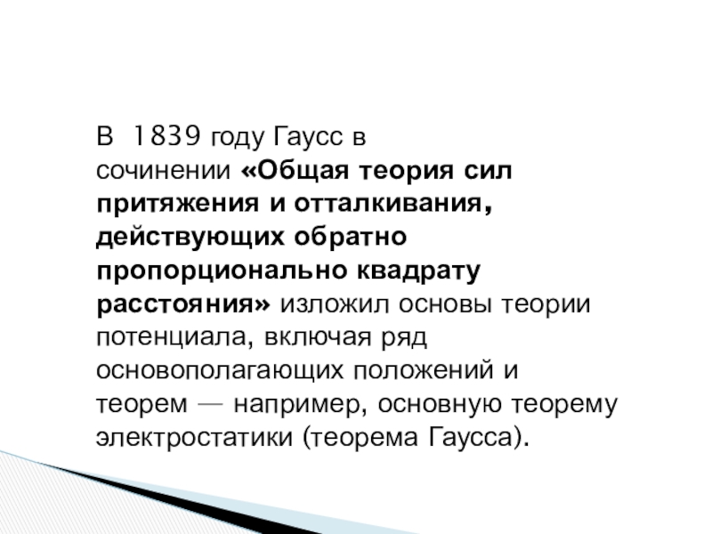 Слайд 21В 1839 году Гаусс в сочинении «Общая теория сил притяжения и отталкивания,