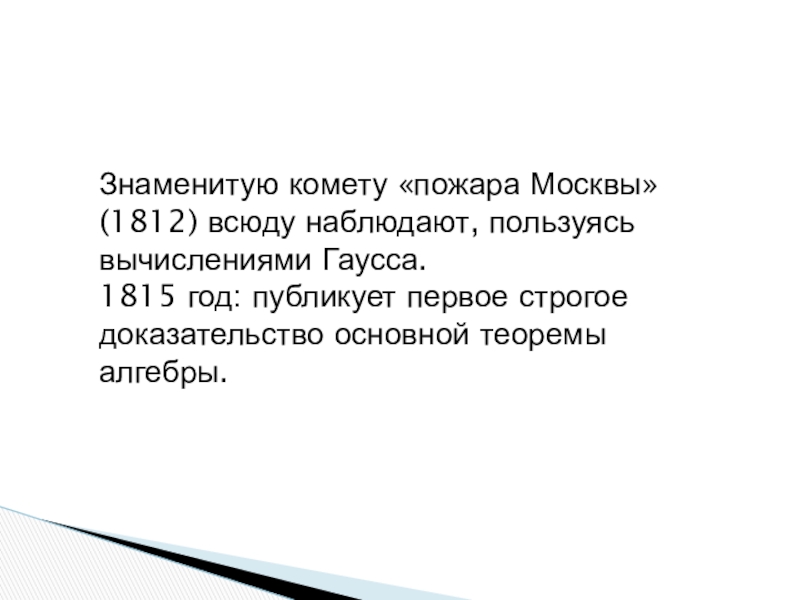 Слайд 18Знаменитую комету «пожара Москвы» (1812) всюду наблюдают, пользуясь вычислениями Гаусса.