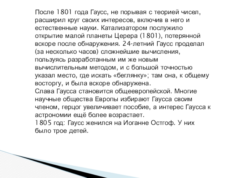 своих интересов, включив в него и естественные науки. Катализатором послужило открытие малой планеты Церера (1801), потерянной вскоре после обнаружения. 24-летний Гаусс проделал (за несколько часов) сложнейшие вычисления, пользуясь разработанным им же новым вычислительным методом, и с большой точностью указал место, где искать «беглянку»; там она, к общему восторгу, и была вскоре обнаружена.