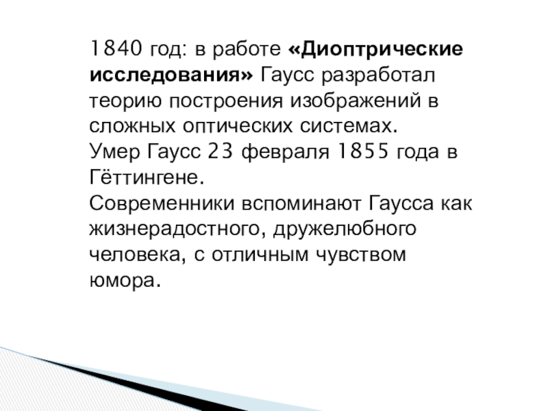Слайд 221840 год: в работе «Диоптрические исследования» Гаусс разработал теорию построения изображений в сложных