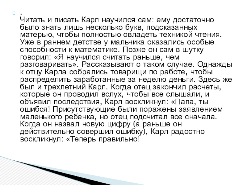 несколько букв, подсказанных матерью, чтобы полностью овладеть техникой чтения. Уже в раннем детстве у мальчика оказались особые способности к математике. Позже он сам в шутку говорил: «Я научился считать раньше, чем разговаривать». Рассказывают о таком случае. Однажды к отцу Карла собрались товарищи по работе, чтобы распределить заработанные за неделю деньги. Здесь же был и трехлетний Карл. Когда отец закончил расчеты, которые он проводил вслух, чтобы все слышали, и объявил последствия, Карл воскликнул: «Папа, ты ошибся! Присутствующие были поражены заявлением маленького ребенка, но отец подсчитал все сначала. Когда он назвал новую цифру (а раньше он действительно совершил ошибку), Карл радостно воскликнул: «Теперь правильно!