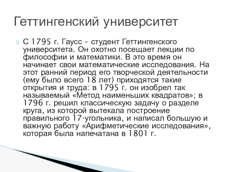 лекции по философии и математики. В это время он начинает свои математические исследования. На этот ранний период его творческой деятельности (ему было всего 18 лет) приходятся такие открытия и труда: в 1795 г. он изобрел так называемый «Метод наименьших квадратов»; в 1796 г. решил классическую задачу о разделе круга, из которой вытекала построение правильного 17-угольника, и написал большую и важную работу «Арифметические исследования», которая была напечатана в 1801 г.