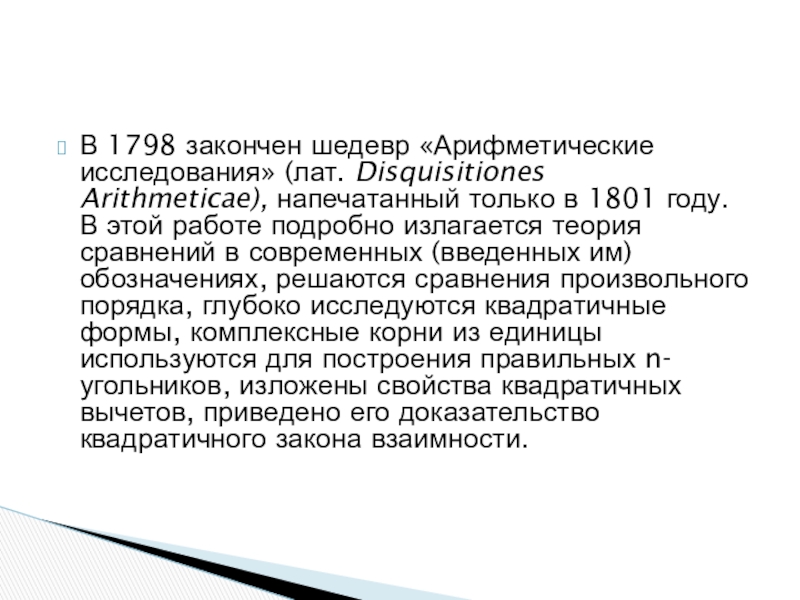 Слайд 13В 1798 закончен шедевр «Арифметические исследования» (лат. Disquisitiones Arithmeticae), напечатанный только в 1801