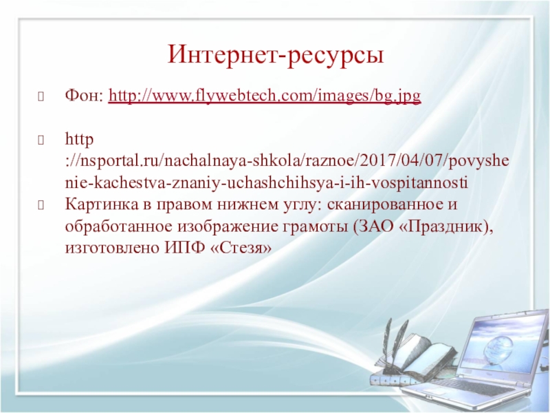 Это сайт презентаций, где можно хранить и обмениваться своими презентациями, докладами, проектами, шаблонами в формате PowerPoint с другими пользователями. Мы помогаем школьникам, студентам, учителям, преподавателям хранить и обмениваться учебными материалами.