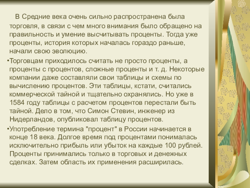 много внимания было обращено на правильность и умение высчитывать проценты. Тогда уже проценты, история которых началась гораздо раньше, начали свою эволюцию.