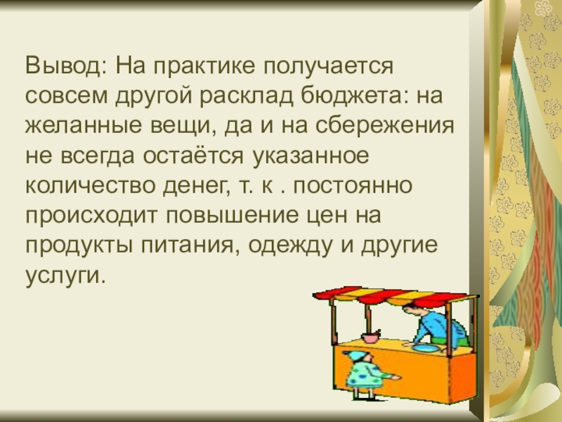 Слайд 19Вывод: На практике получается совсем другой расклад бюджета: на желанные вещи,