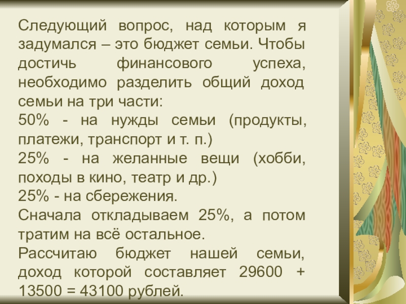 Слайд 17Следующий вопрос, над которым я задумался – это бюджет семьи. Чтобы