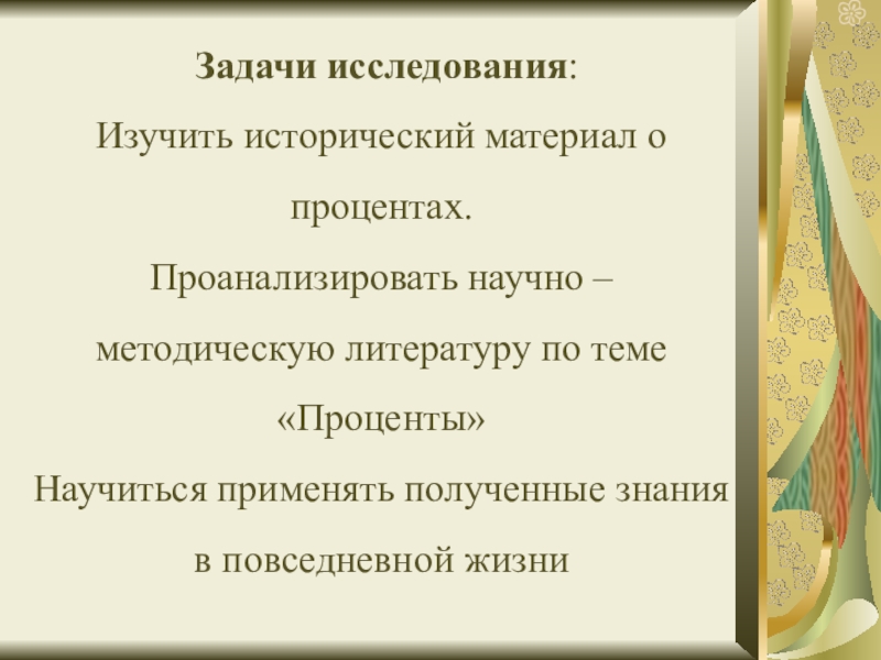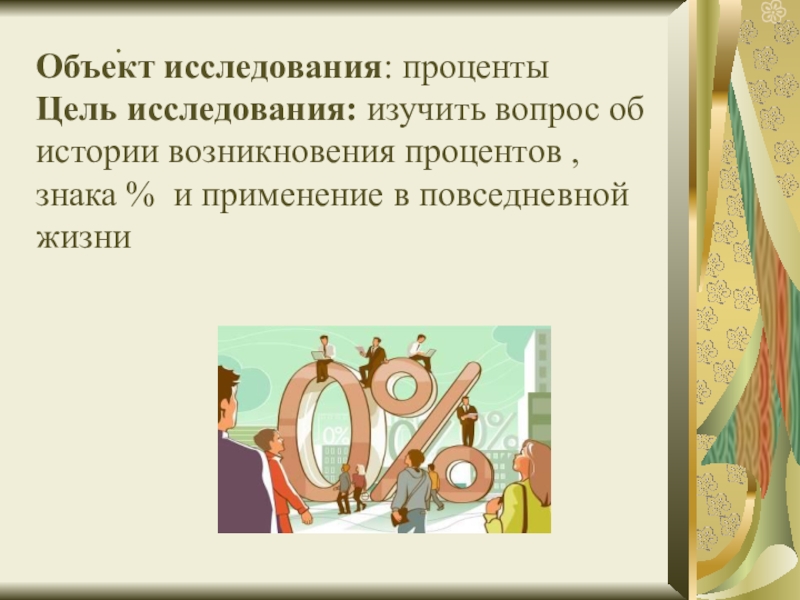 Цель исследования: изучить вопрос об истории возникновения процентов , знака % и применение в повседневной жизни