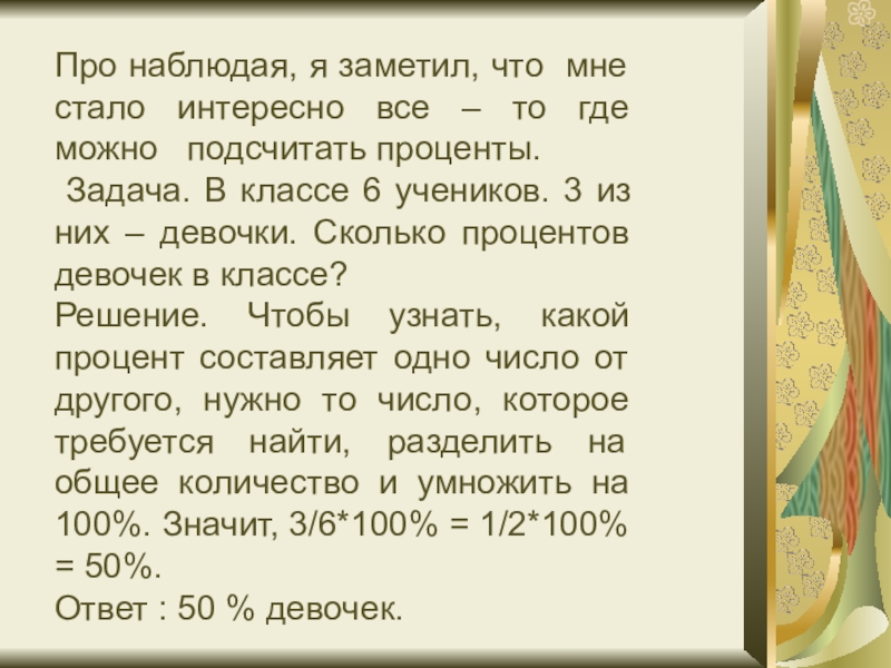 Задача. В классе 6 учеников. 3 из них – девочки. Сколько процентов девочек в классе?