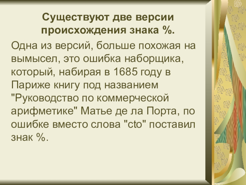 в слове "cto" (которым ранее обозначали проценты). В скорописи буква t превратилась в черту (/), а затем и современный знак cto - c/o - %. Мы уже не узнаем, какая из версий правильная, однако знаком % пользуются в современном мире, и очень активно.