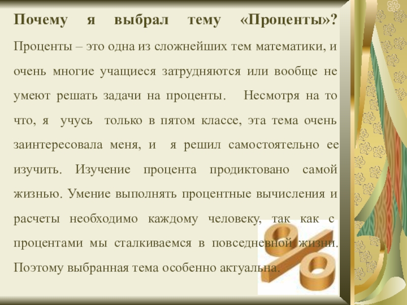 математики, и очень многие учащиеся затрудняются или вообще не умеют решать задачи на проценты. Несмотря на то что, я учусь только в пятом классе, эта тема очень заинтересовала меня, и я решил самостоятельно ее изучить. Изучение процента продиктовано самой жизнью. Умение выполнять процентные вычисления и расчеты необходимо каждому человеку, так как с процентами мы сталкиваемся в повседневной жизни. Поэтому выбранная тема особенно актуальна.