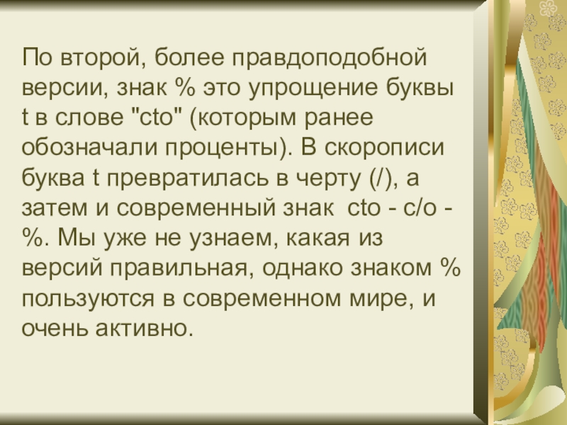 Слайд 12По второй, более правдоподобной версии, знак % это упрощение буквы t