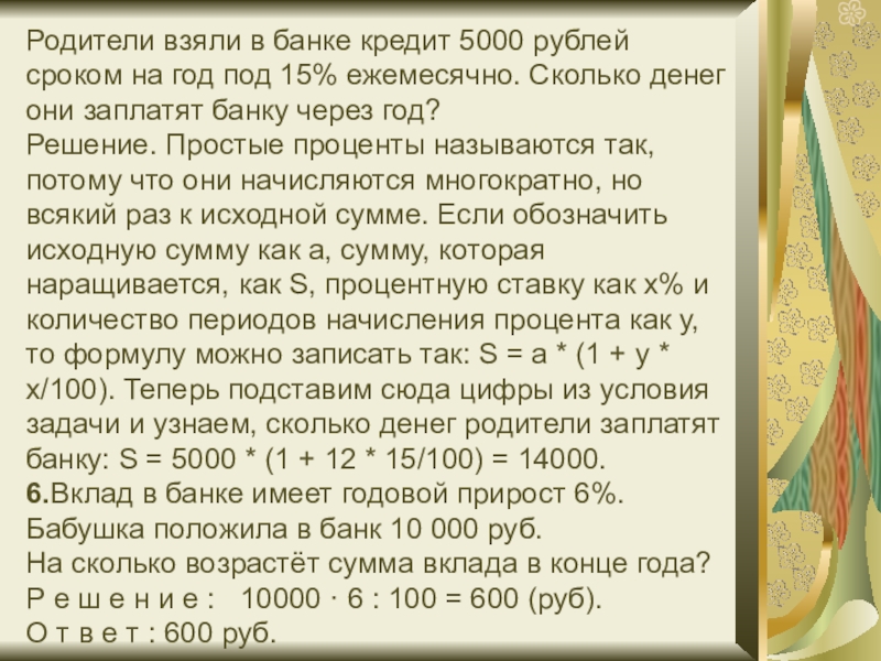 Решение. Простые проценты называются так, потому что они начисляются многократно, но всякий раз к исходной сумме. Если обозначить исходную сумму как а, сумму, которая наращивается, как S, процентную ставку как х% и количество периодов начисления процента как у, то формулу можно записать так: S = а * (1 + у * х/100). Теперь подставим сюда цифры из условия задачи и узнаем, сколько денег родители заплатят банку: S = 5000 * (1 + 12 * 15/100) = 14000.