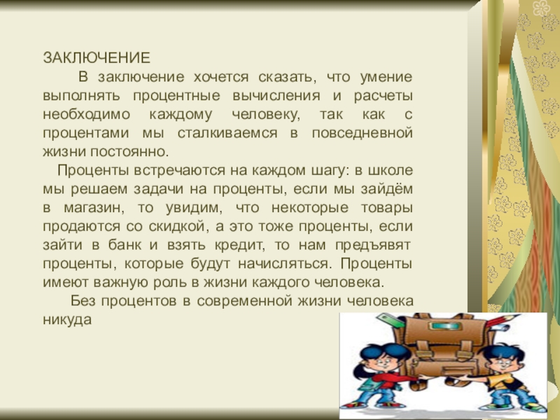 Проценты встречаются на каждом шагу: в школе мы решаем задачи на проценты, если мы зайдём в магазин, то увидим, что некоторые товары продаются со скидкой, а это тоже проценты, если зайти в банк и взять кредит, то нам предъявят проценты, которые будут начисляться. Проценты имеют важную роль в жизни каждого человека.