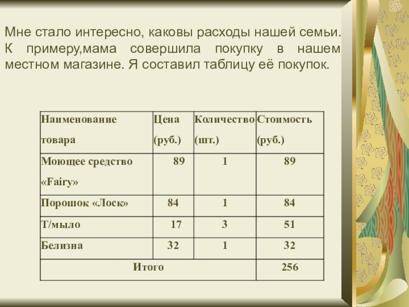 Слайд 20Мне стало интересно, каковы расходы нашей семьи. К примеру,мама совершила покупку