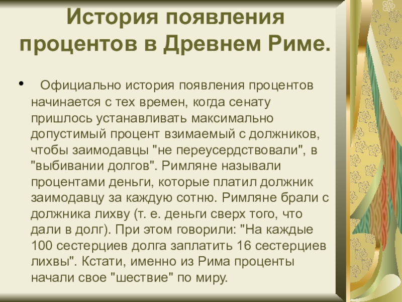с тех времен, когда сенату пришлось устанавливать максимально допустимый процент взимаемый с должников, чтобы заимодавцы "не переусердствовали", в "выбивании долгов". Римляне называли процентами деньги, которые платил должник заимодавцу за каждую сотню. Римляне брали с должника лихву (т. е. деньги сверх того, что дали в долг). При этом говорили: "На каждые 100 сестерциев долга заплатить 16 сестерциев лихвы". Кстати, именно из Рима проценты начали свое "шествие" по миру.